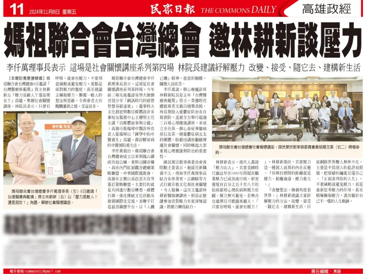 媽祖聯合會台灣總會關懐社會系列講座 林耕新院長:健康正面的態度迎接壓力