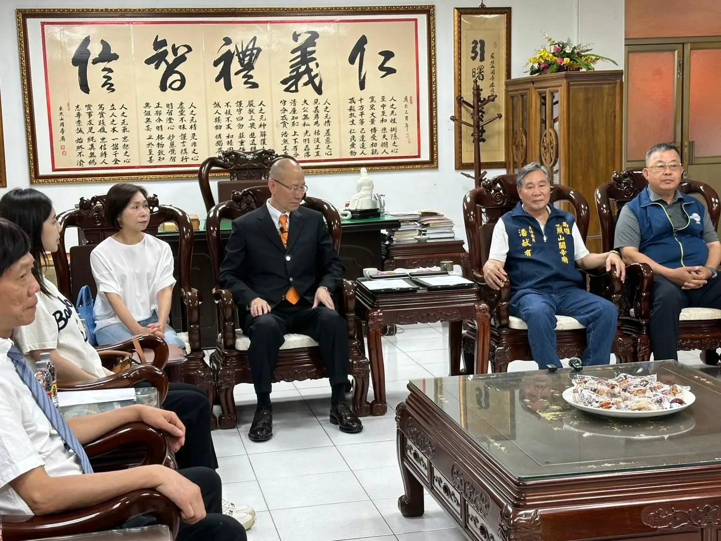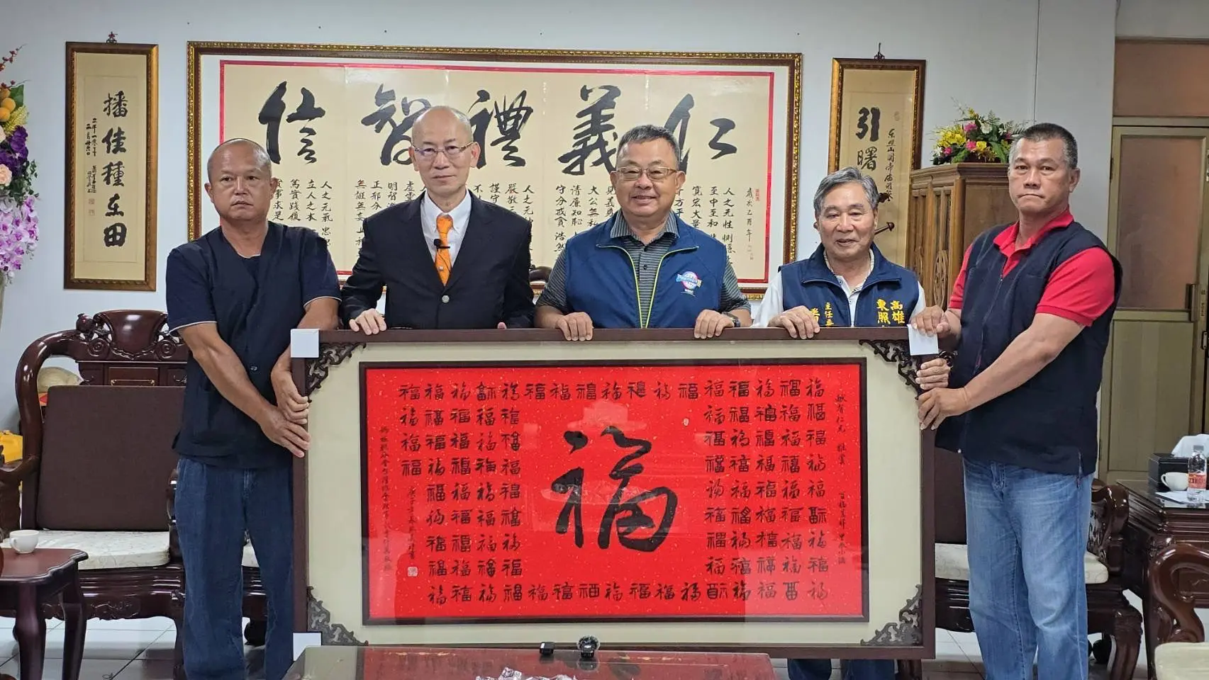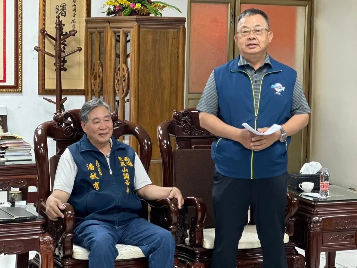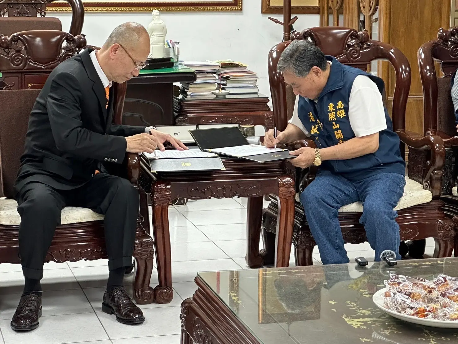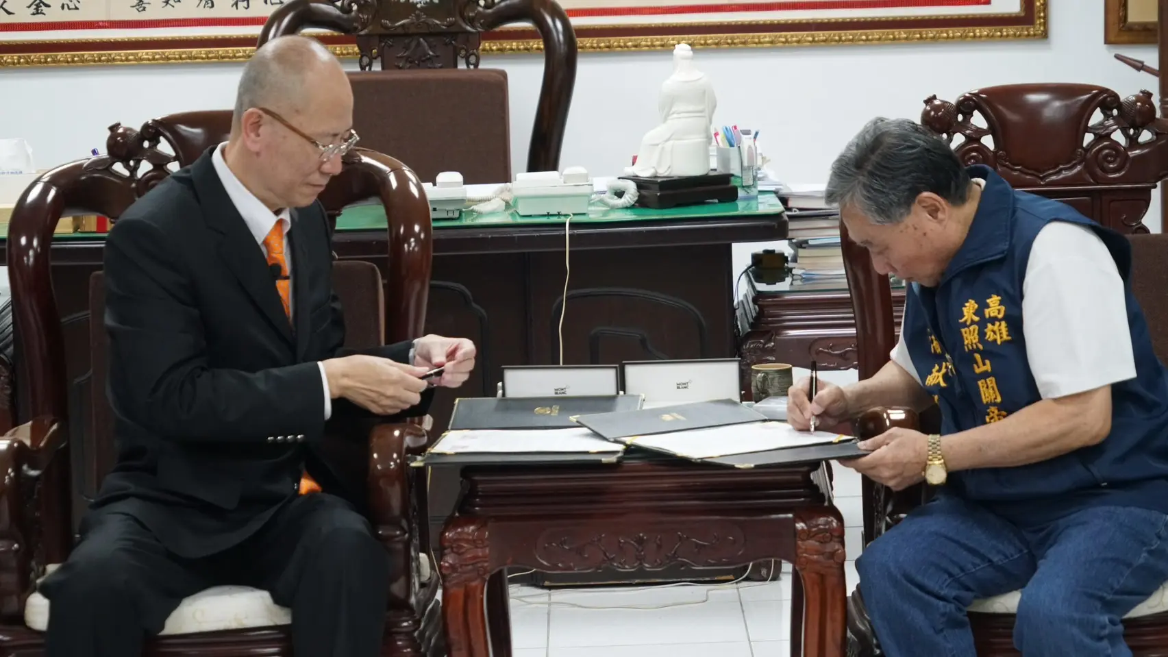 媽祖聯合會台灣總會李仟萬理事長率團隊前往高雄市大樹區東照山關帝廟,在前內政部長余政憲見證下,與潘献有主委簽訂策略聯盟。
