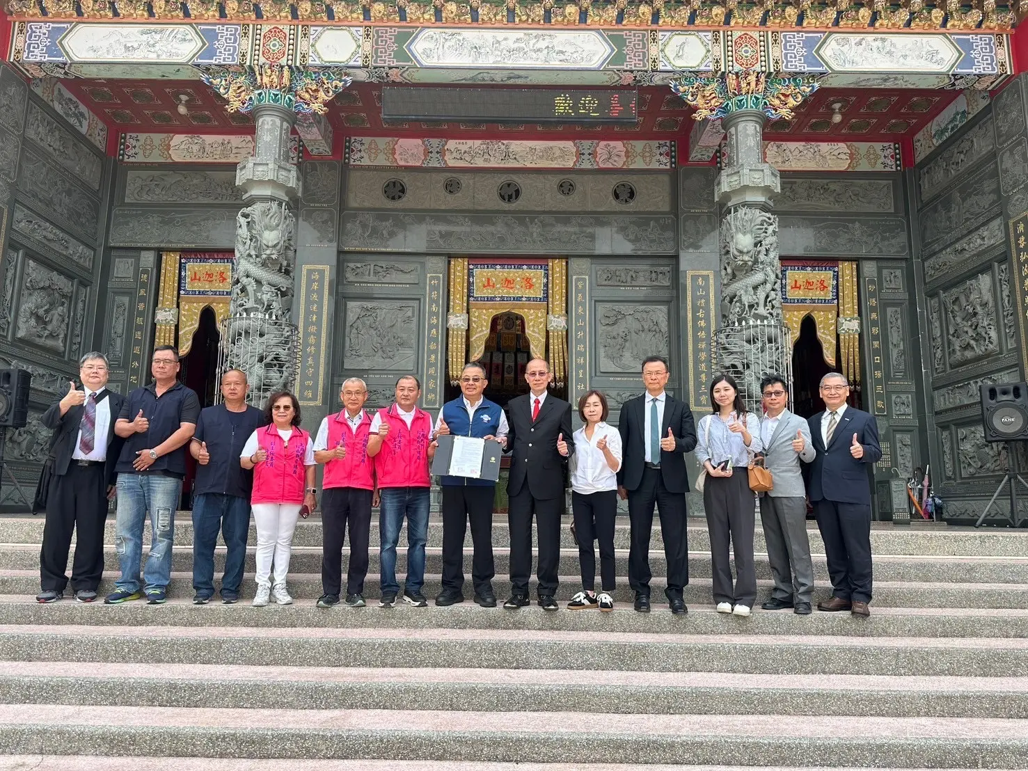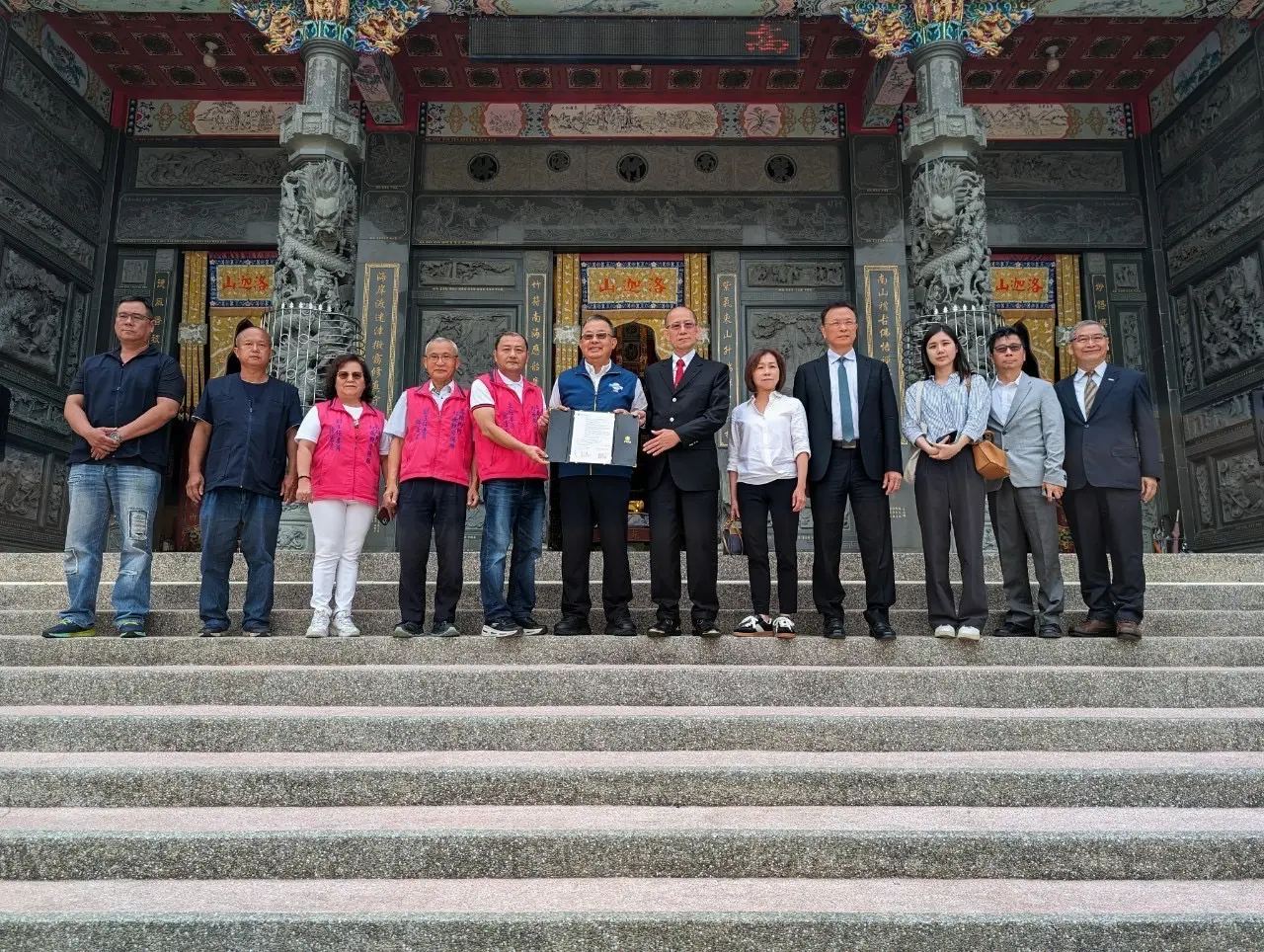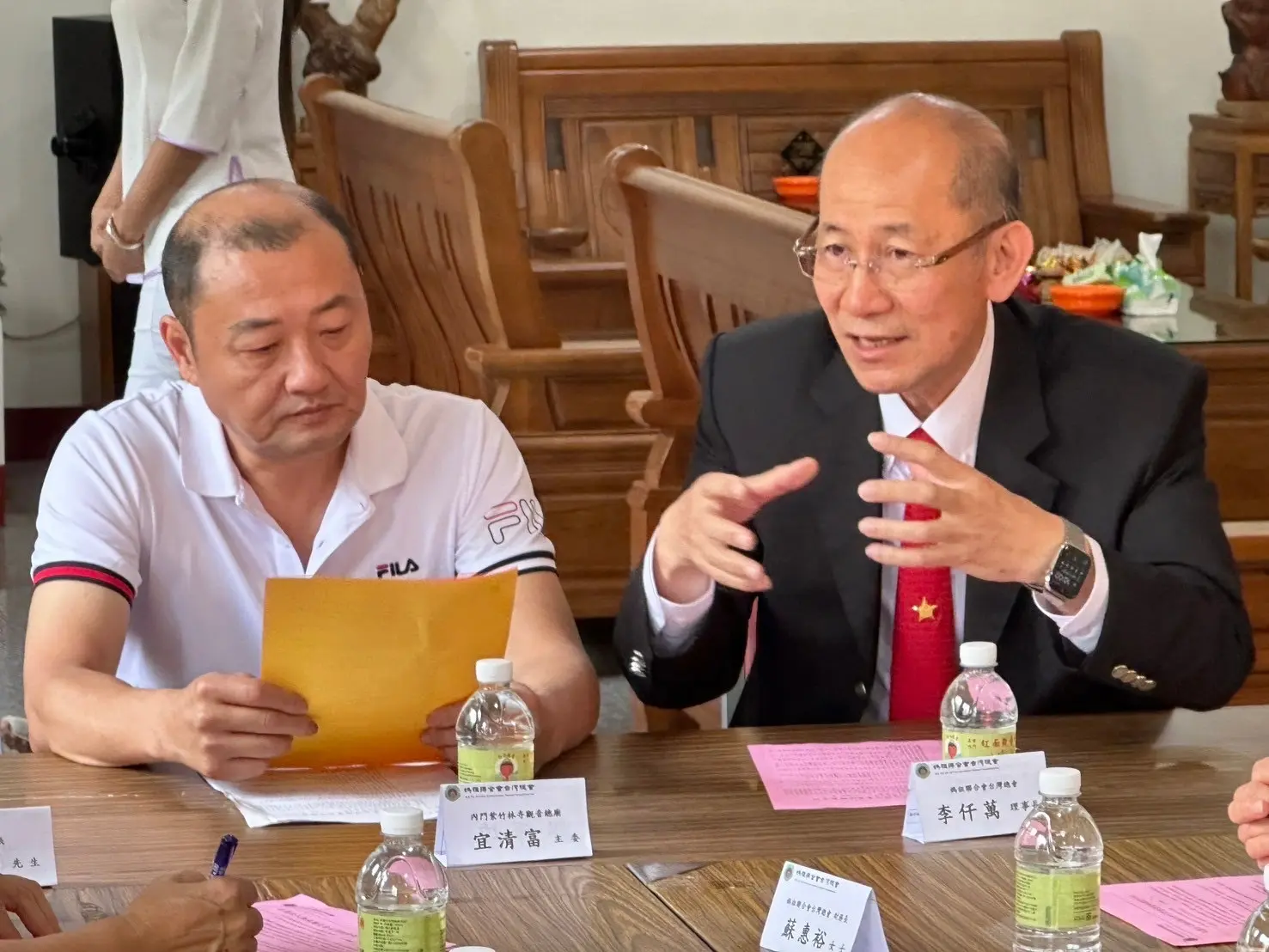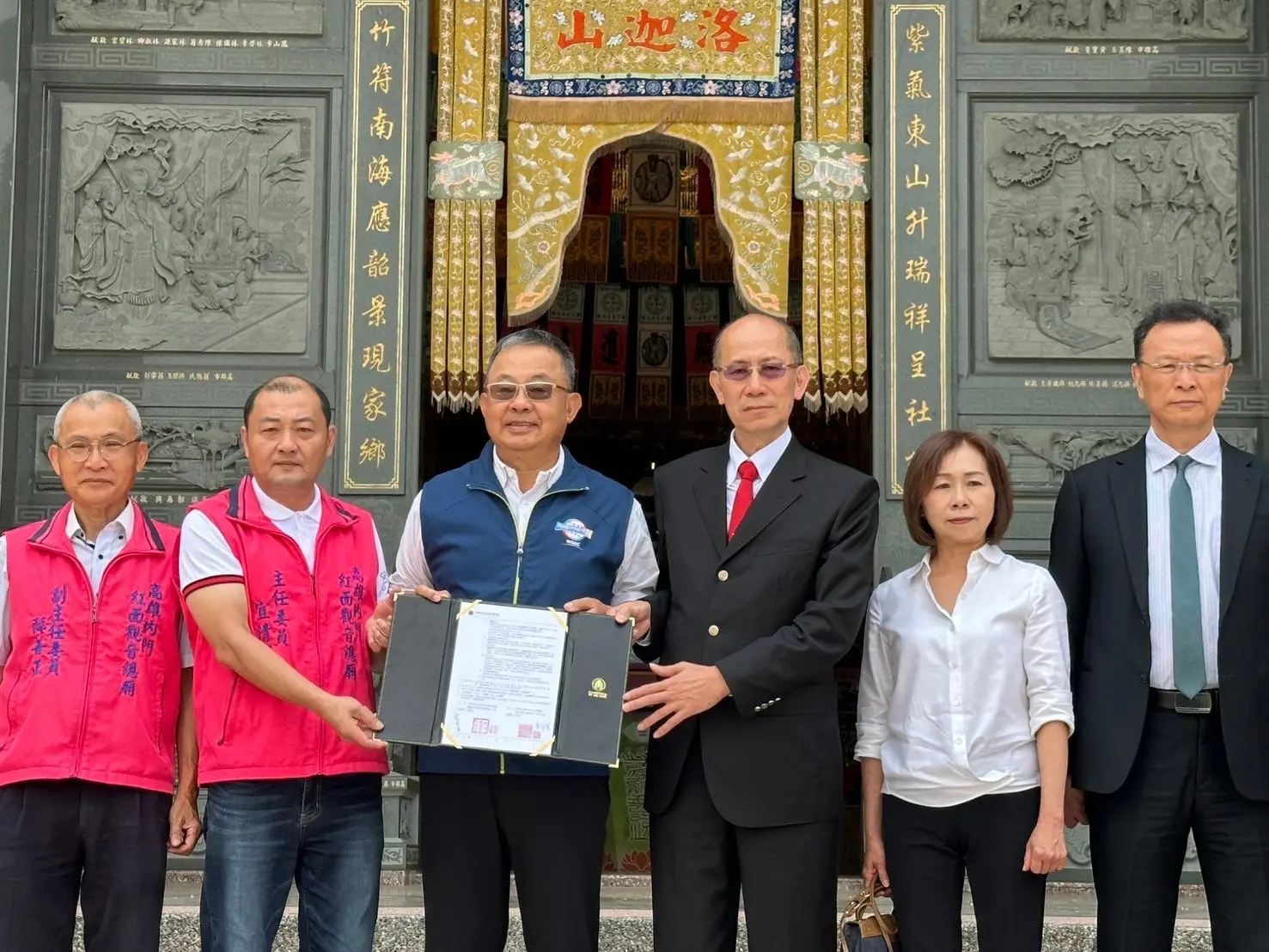 媽祖聯合會台灣總會李仟萬理事長十一日率團隊前往高雄內門紅面觀音總廟,在前內政部長余政憲見證下,與宜清富主委簽訂策略聯盟。
