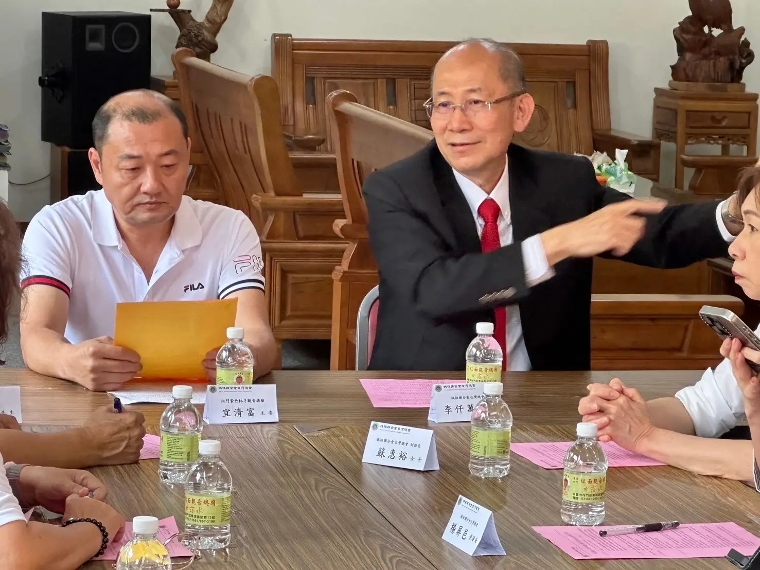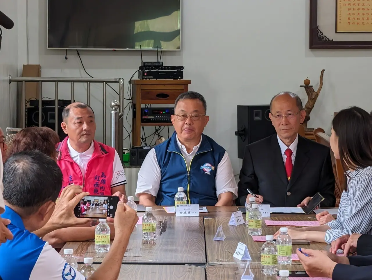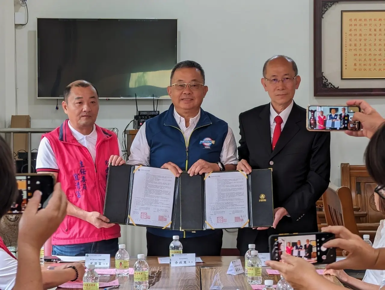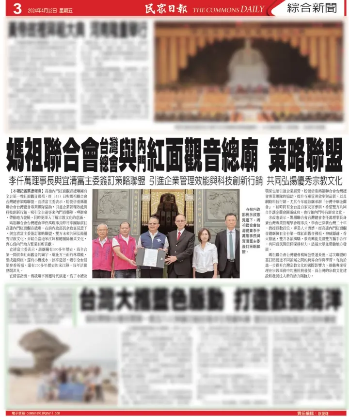 媽祖聯合會台灣總會李仟萬理事長十一日率團隊前往高雄內門紅面觀音總廟,在前內政部長余政憲見證下,與宜清富主委簽訂策略聯盟,雙方未來共同弘揚優秀宗教文化,並結合當地宋江陣和總舖師辦桌文化,齊心為內門地方繁榮有所貢獻。
