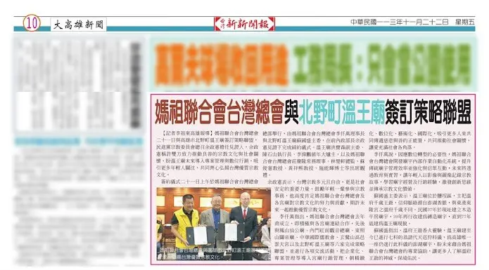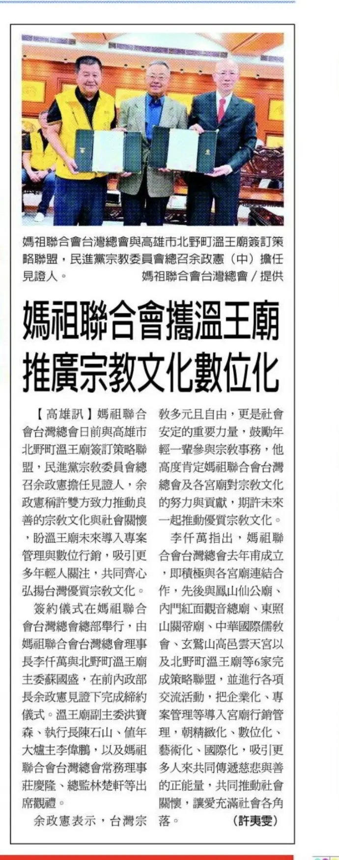 媽祖聯合會台灣總會二十一日與高雄市北野町溫王廟簽訂策略聯盟,民進黨宗教委員會總召余政憲擔任見證人,余政憲稱許雙方致力推動良善的宗教文化與社會關懷,盼溫王廟未來導入專案管理與數位行銷,吸引更多年輕人關注,共同齊心弘揚台灣優質宗教文化。
