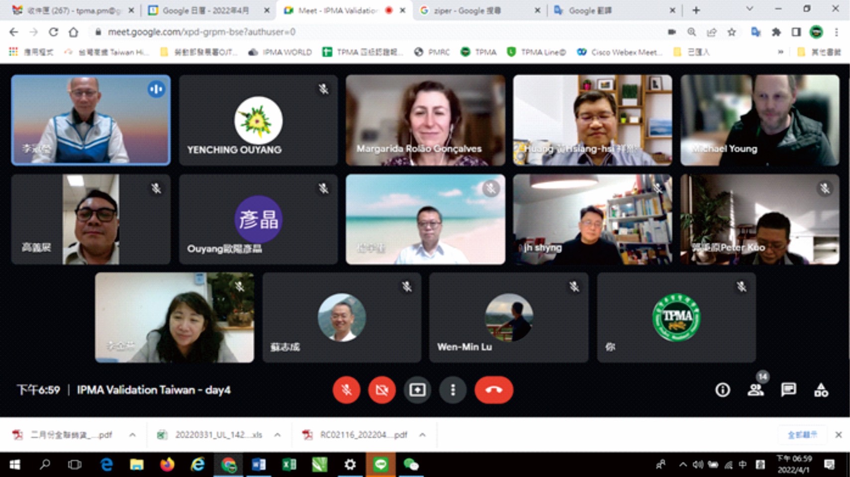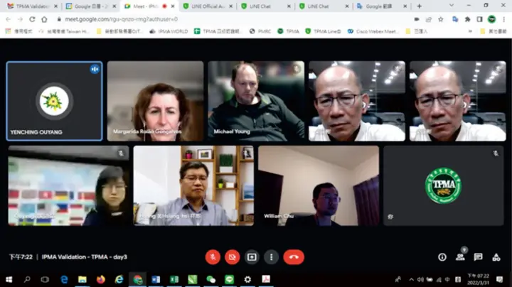 台灣專案管理學會 ( TPMA ) 依循IPMA規範,於2022年3月29日至4月1日連續四天,由 TPMA 認證委員會主任委員 李仟萬先生 ( 國家首席評估師 NFA ),帶領認證委員會副主任委員 歐陽彥晶教授、計畫委員會主任委員 黃祥熙教授、認證評估師 盧文民教授、資深專案經理 許智旺、蘇秋皇及相關委員,配合IPMA CVMB ( 認證機構 ) IPMA – Lead validator - Margarida Gonçalves ( 瑪格麗達 貢薩爾維斯 ) 及 Co-validator – Michael Young ( 邁克爾·楊 )等二位國際驗證評估師進行三年一次的ICR4認證規範驗證,並經686項驗證順利通過IPMA ICR4 認證品質肯定。