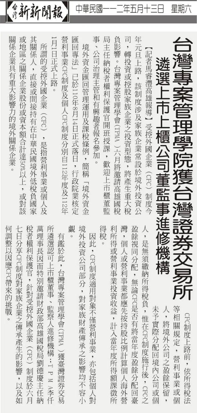 受控外國企業(CFC)制度今年元旦上路,該制度涉及家族企業常設於境外投資公司,轉投資或控股家族企業之投資型態,將產生重大稅負影響。台灣專案管理學會(TPMA )六月將邀請高雄國稅局主任納稅者權利保護官開班授課,歡迎上市櫃董監事、公司治理主管和有興趣者報名參加。