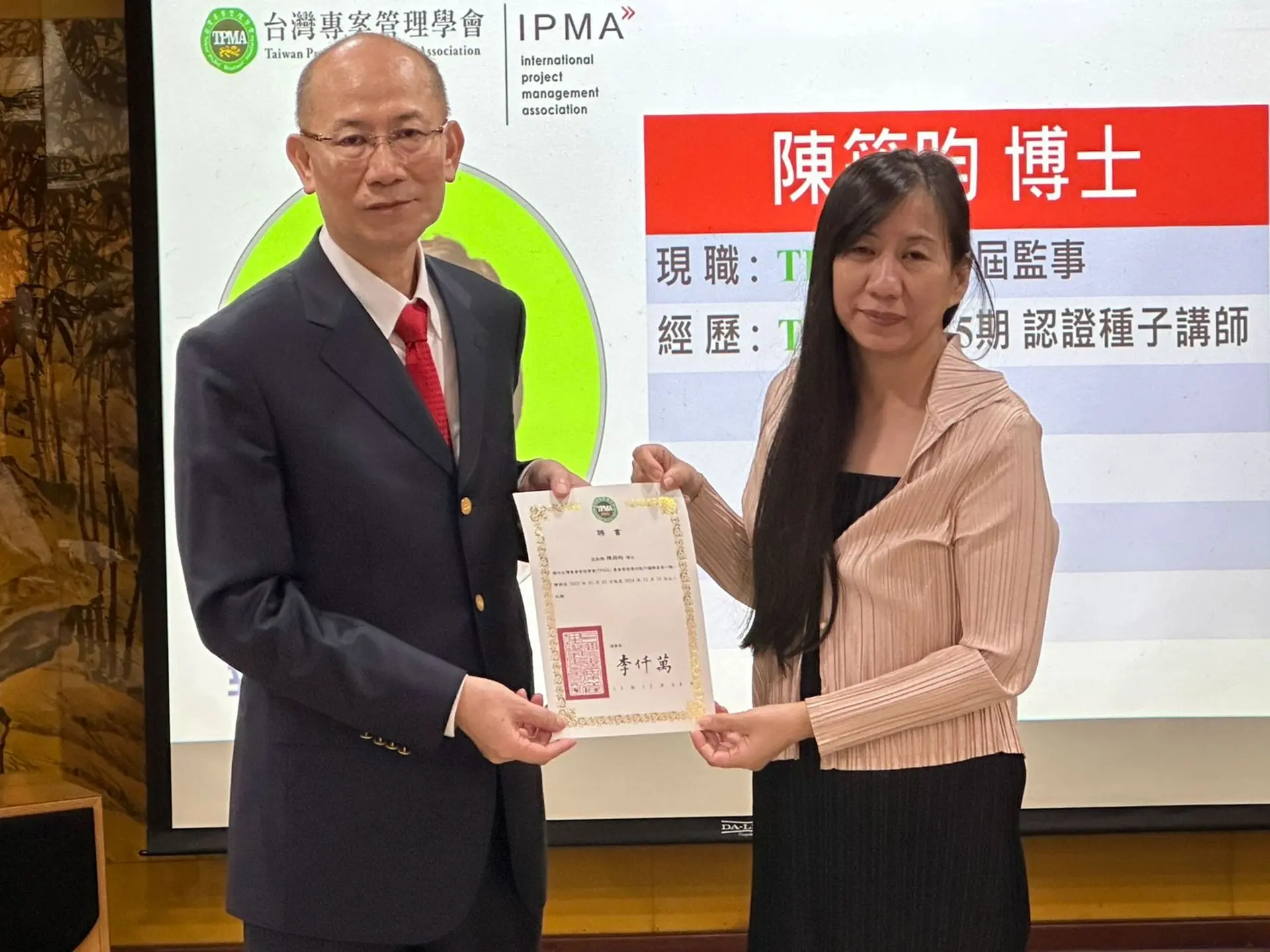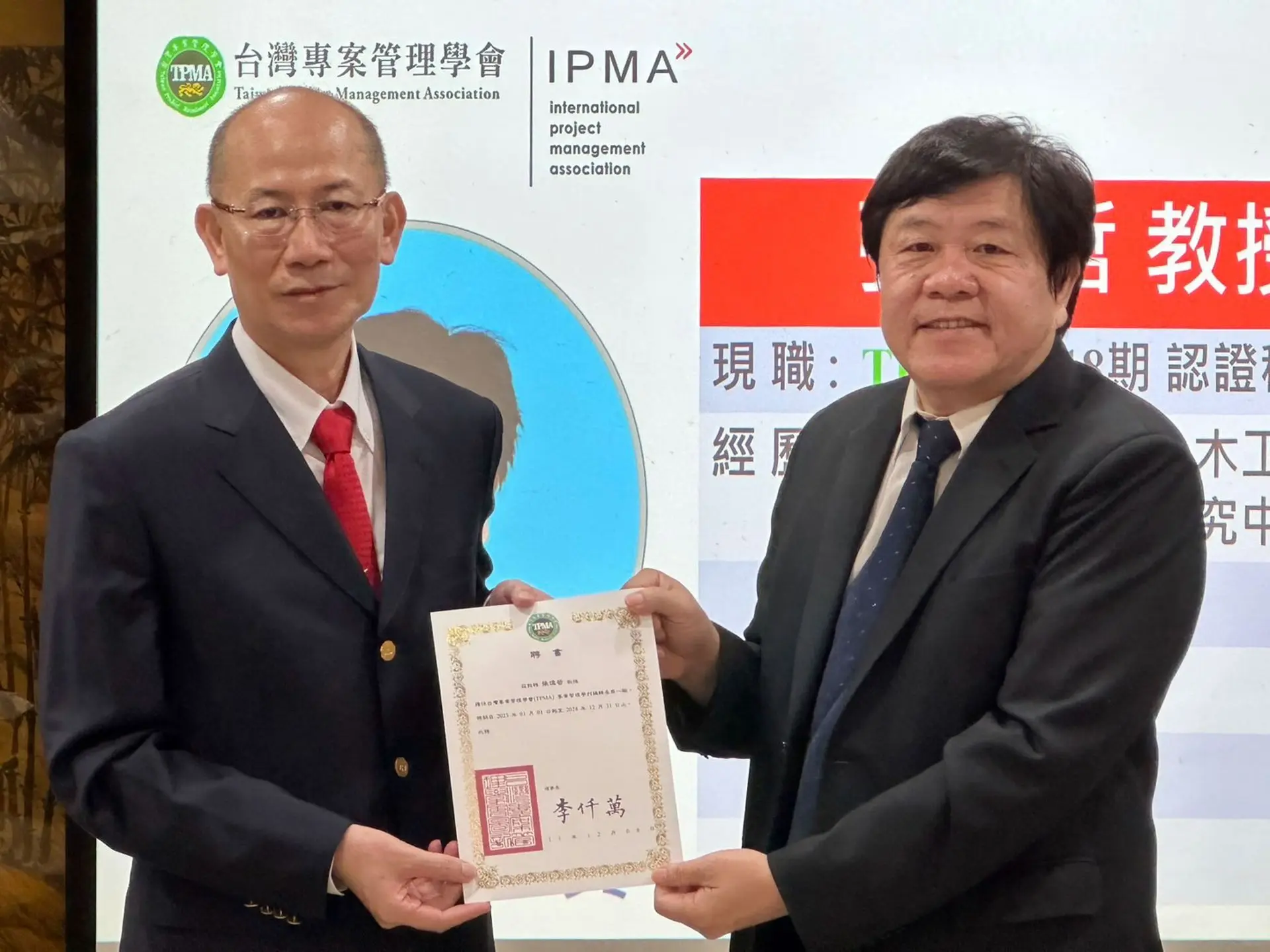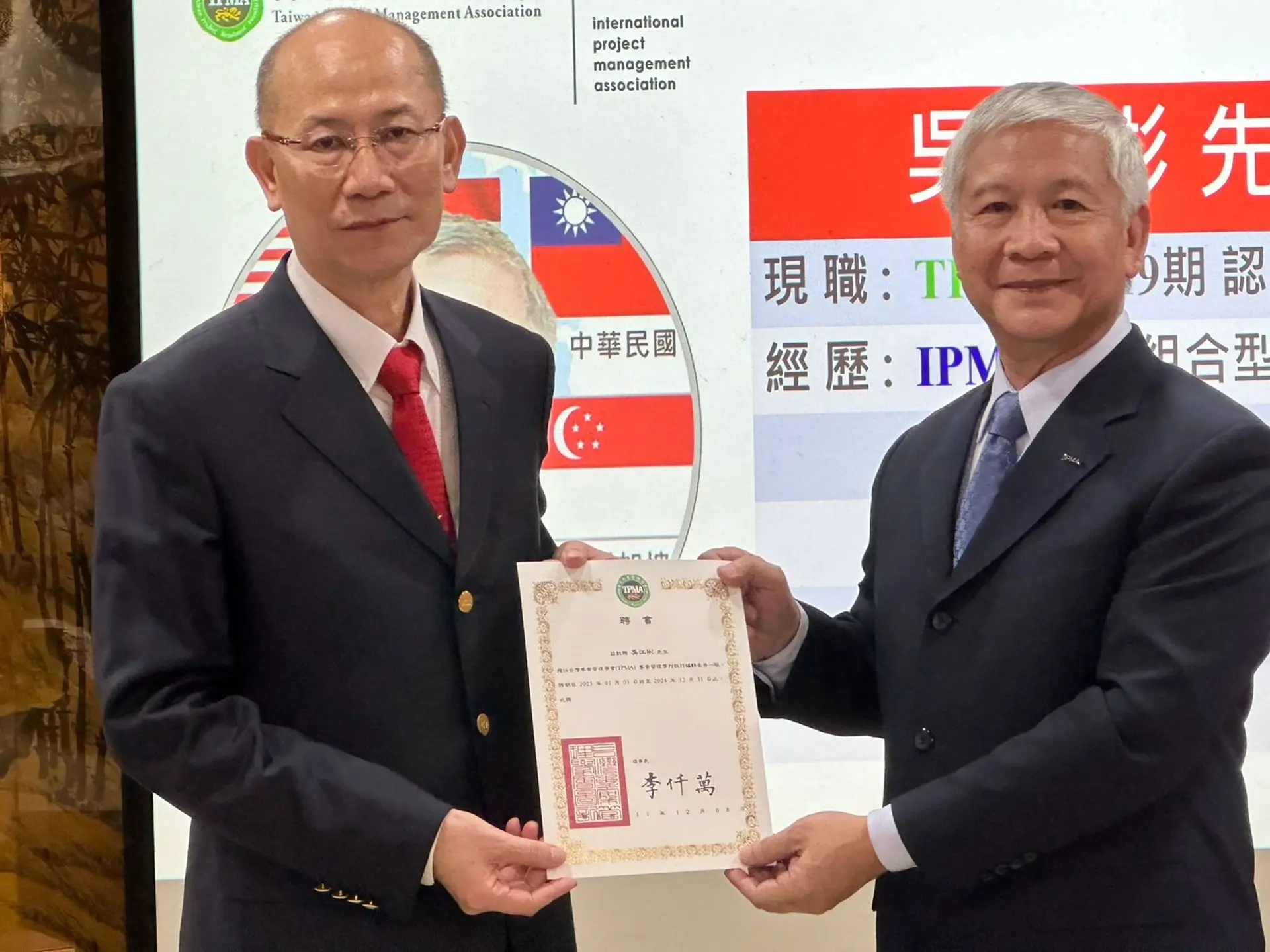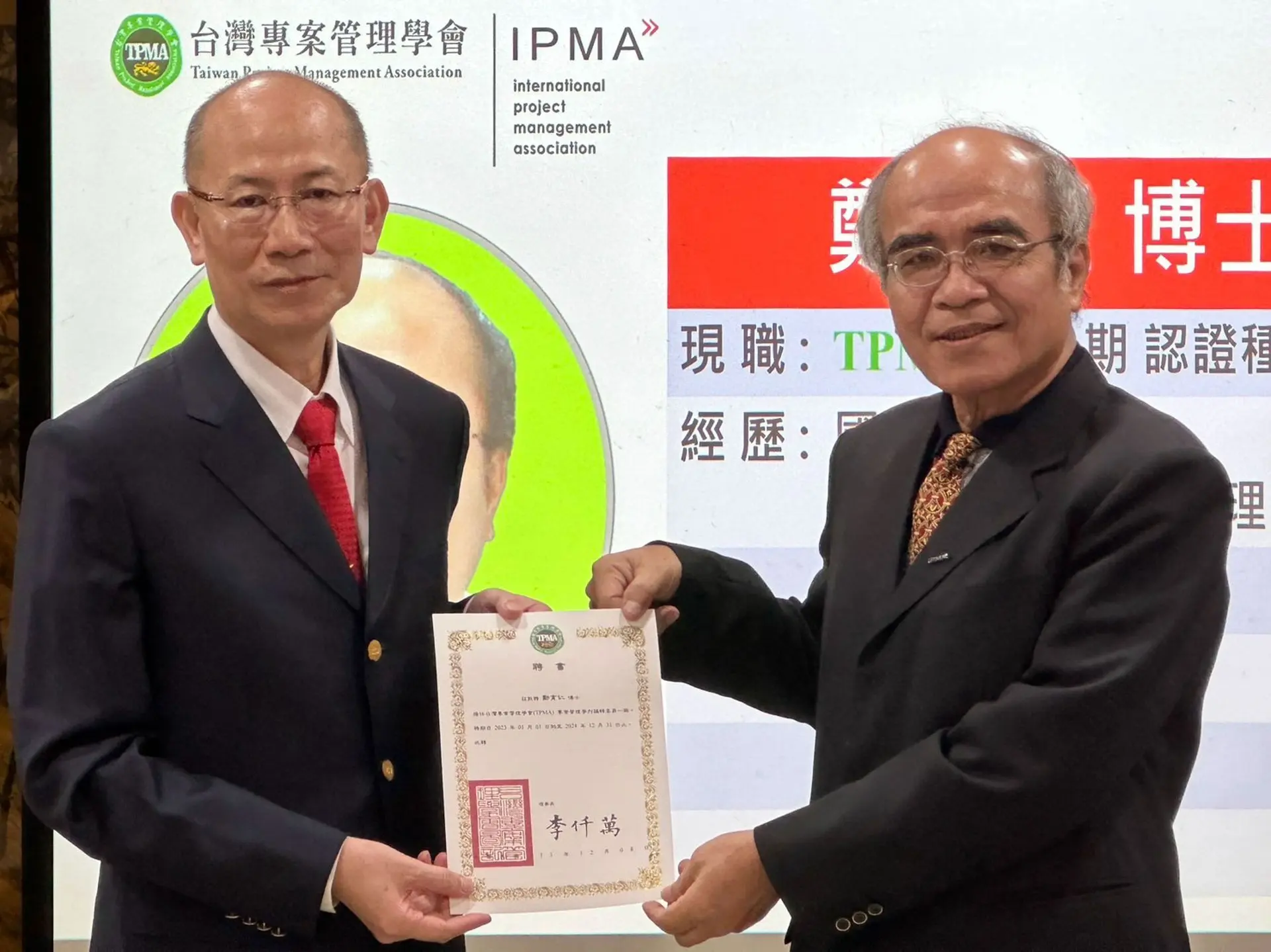 台灣專案管理學會是國際專案管理協會 ( IPMA, International Project Management Association ) 的國家級會員及國際認證機構,IPMA國際證照全球 72 個會員國,目的在於提升國內各級政府單位與產業界及個人的專案管理能力,近年積極推動認證數位化,並獲得各級政府單位及產業界熱烈支持與肯定。截至目前為止,TPMA已協助一萬名以上自然人含法人機構取得 IPMA 的 A、B、C、D 四級國際專案管理師認證並落實專案管理之運用與推廣。