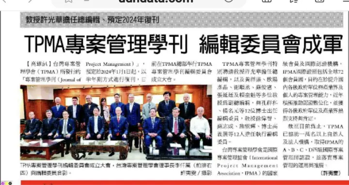 台灣專案管理學會(簡稱 TPMA )日前召開專案管理學刊委員會成立大會,決定 2024 年元旦復刊「專案管理學刊」,李仟萬理事長表示,這將是台灣專案管理學術研究的最高殿堂,盼藉由理論、實務性成果再進化,嘉惠各領域都能更快速且有效率達成預期目標,提升台灣的國際競爭力。